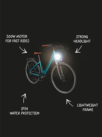 Dank integrierter Sicherheitsmerkmale wie reflektierenden 700c-Reifen für bessere Sichtbarkeit, einem schwenkbaren Scheinwerfer, der Ihren Kurven folgt, und einem automatisch leuchtenden Bremslicht, das sich beim Abbremsen aktiviert, können Sie beruhigt fahren. Eine eingebaute Hupe sorgt dafür, dass Sie im Straßenverkehr gehört werden, und verleiht jeder Fahrt ein zusätzliches Maß an Sicherheit.