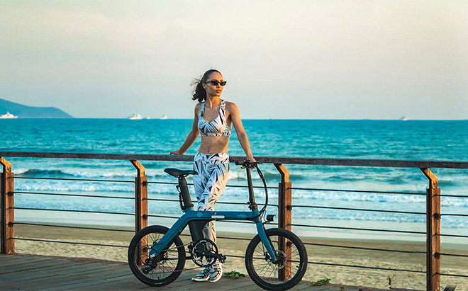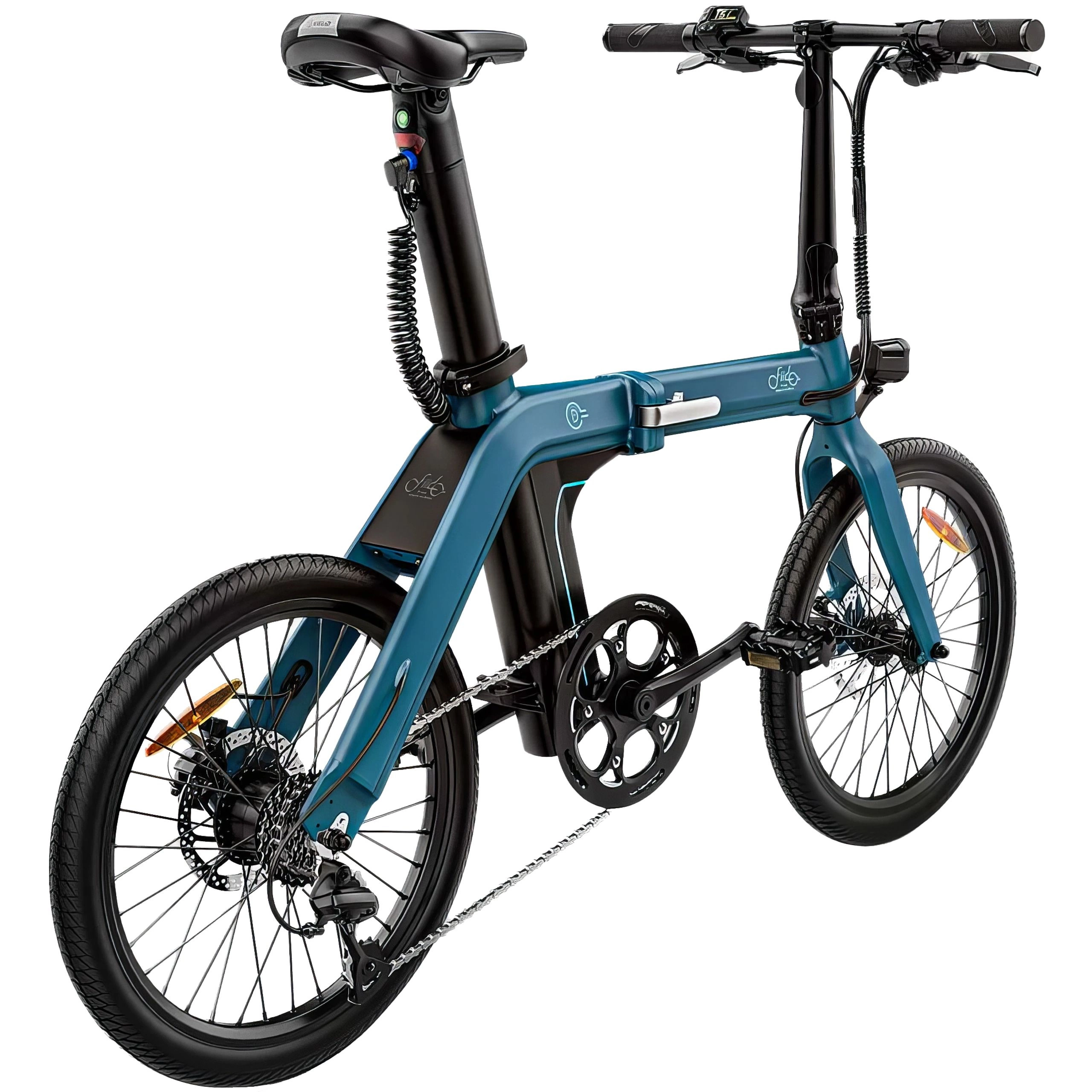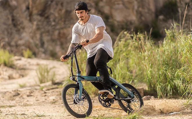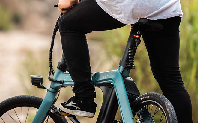 Das Fiido D11 kommt in auffälligem Teal-Blau mit einem einzigartigen M-förmigen Rahmen. Der Akku ist in der Sattelstütze versteckt und sorgt so für ein aufgeräumtes Design. Schwarzer Sattel, Lenker und Bremsen bilden einen perfekten Kontrast. Die 20-Zoll-Räder mit schmalen Reifen sorgen für einen sportlichen Look, und auch im zusammengeklappten Zustand sieht das Fahrrad noch gut aus.