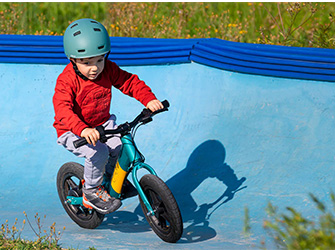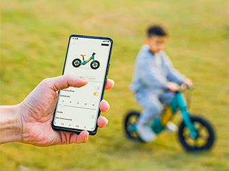 Wenn sich Ihr Kind mit den Beinen abstößt, erkennen die Sensoren des Fahrrads diese Anstrengung und unterstützen es einige Sekunden lang sanft. Auf diese Weise lernen Kinder das richtige Gleichgewicht.