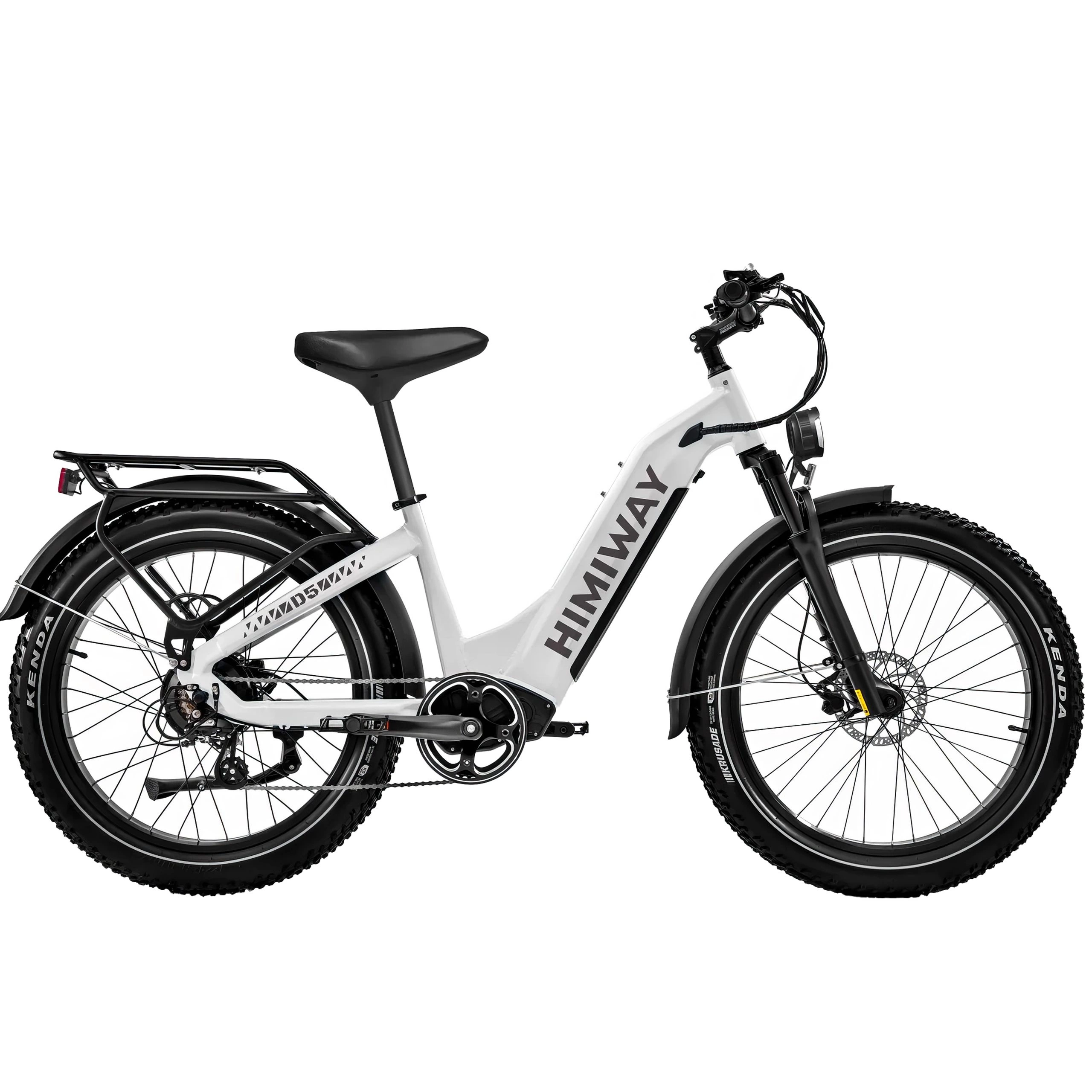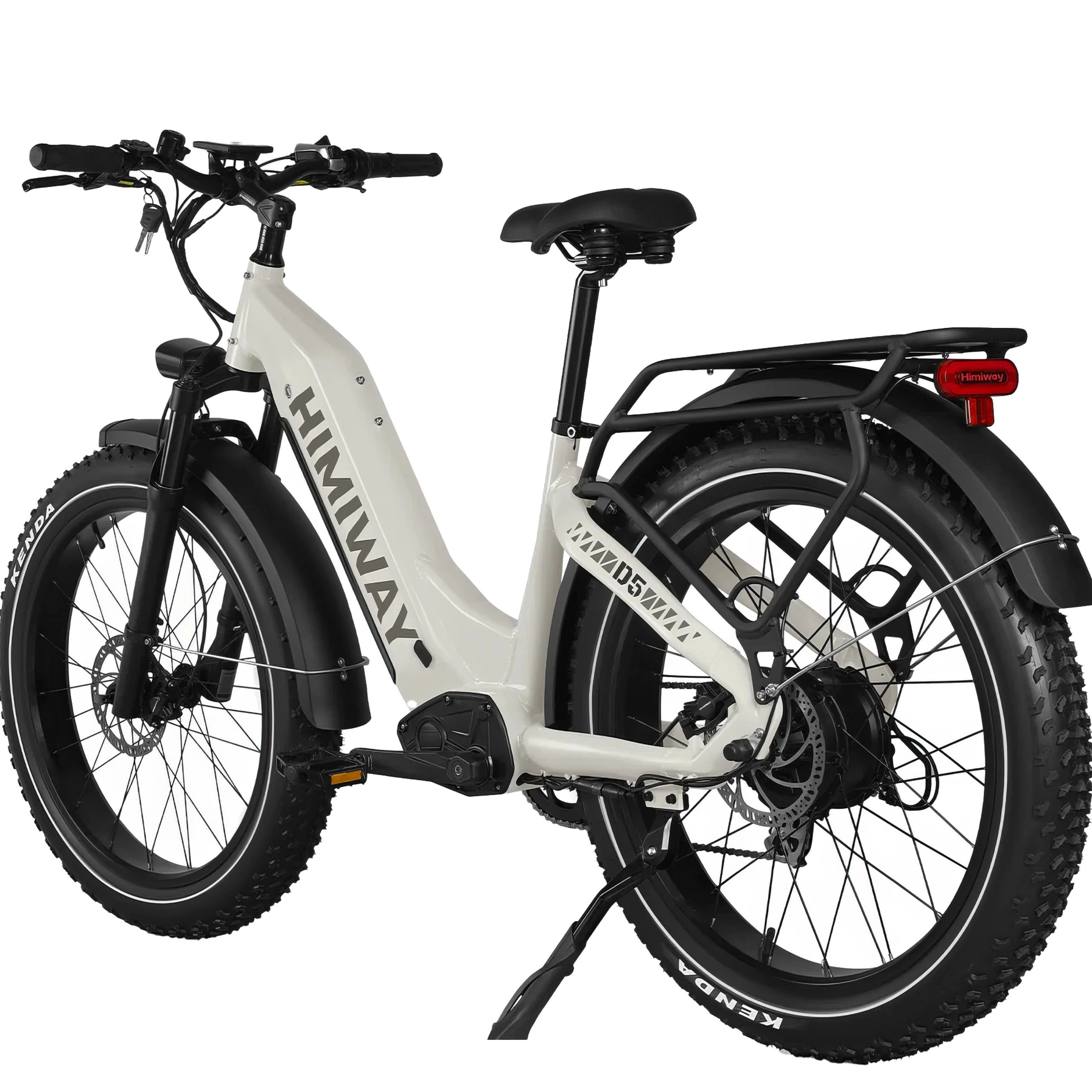 Das Himiway D5 Zebra High-Step hat einen schnittigen weißen Rahmen mit dicken Offroad-Reifen und einer Federgabel für unwegsames Terrain. Das Fahrrad verfügt über Schutzbleche, damit Sie sauber bleiben, einen stabilen Gepäckträger und Scheibenbremsen. Das High-Step-Rahmendesign bietet eine traditionelle Fahrposition.